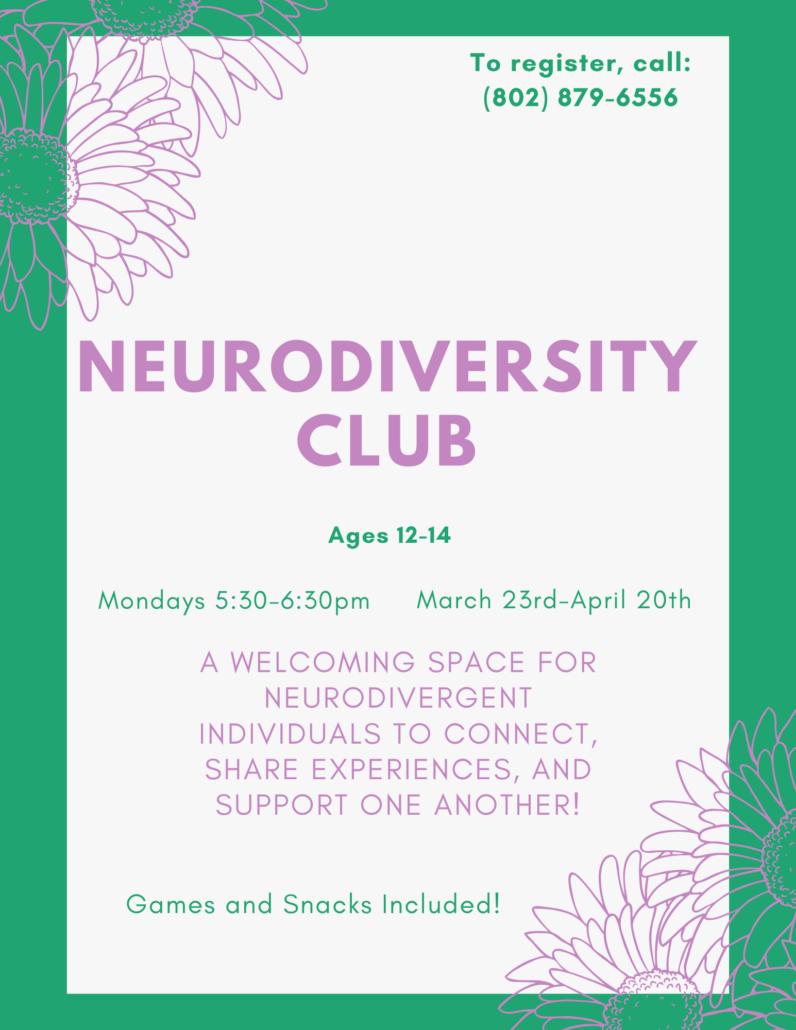 Structured group work has been a successful approach for many of our patients who are seeking mental health support. Attendees receive evidence-based information from our counselors on topics such as parenting, anxiety, depression, and strategies to support their well-being. If you are interested in one of our groups, please call the front desk, (802) 879-6556.