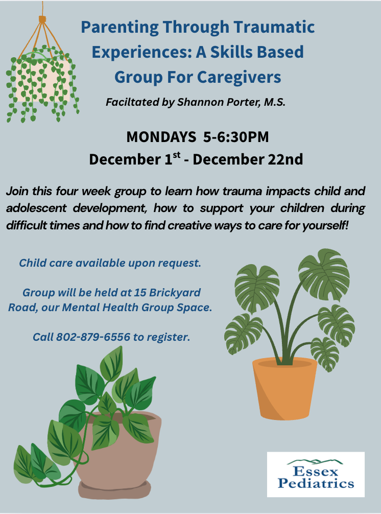 Join this four week group to learn how trauma impacts child and adolescent development, how to support your children during difficult times, and how to find creative ways to care for yourself.